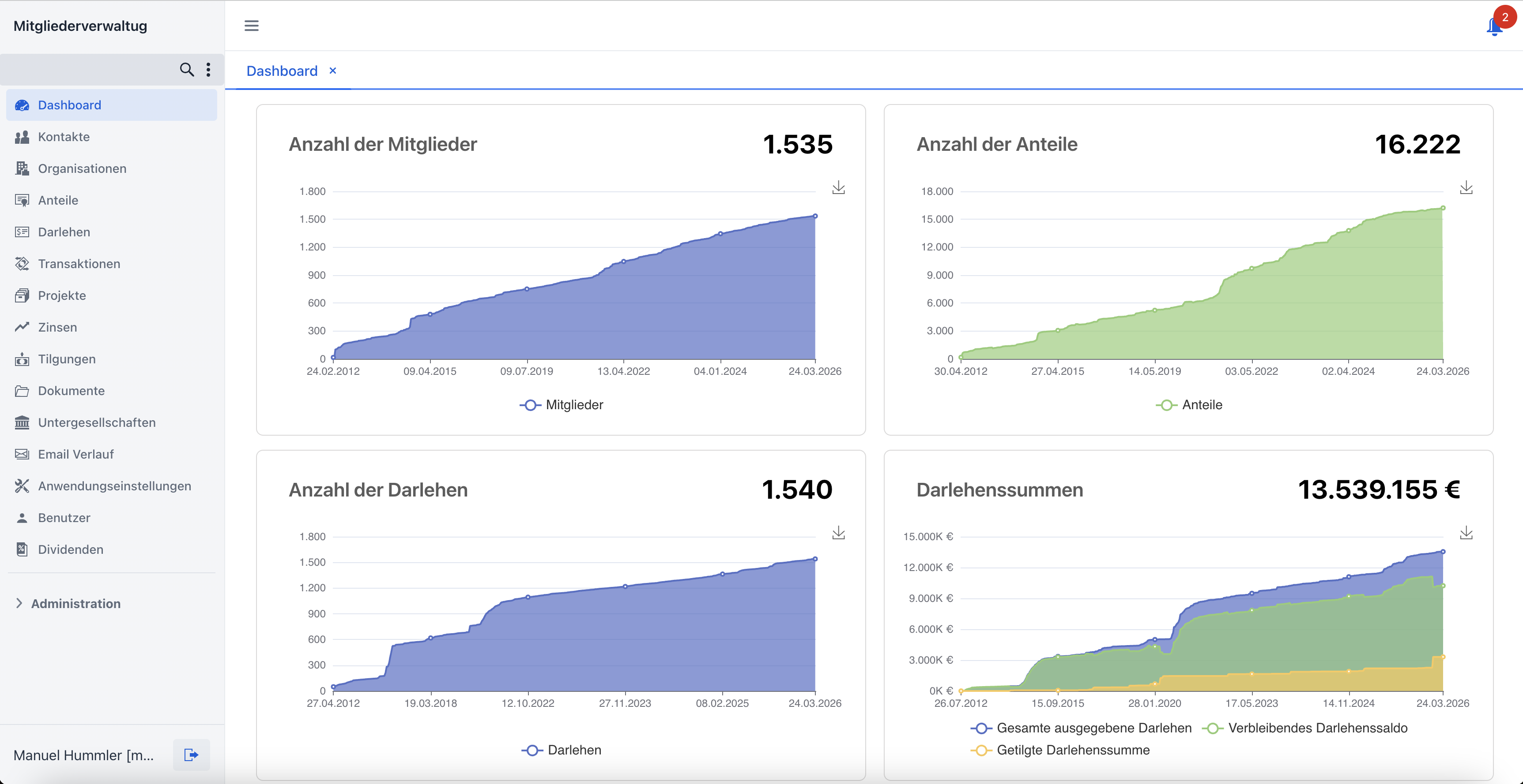 Alle wichtigen Kennzahlen Ihrer Genossenschaft auf einen Blick – Mitglieder, Anteile, Darlehen und Finanzen übersichtlich in einem Dashboard.